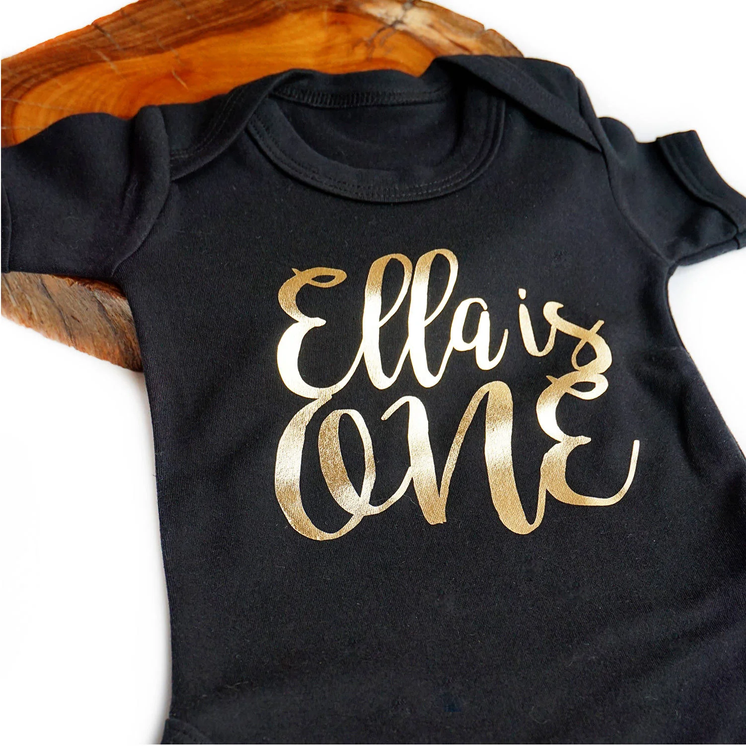 First birthday bodysuit with GOLD lettering. Choose any name to personalise your bodysuit.