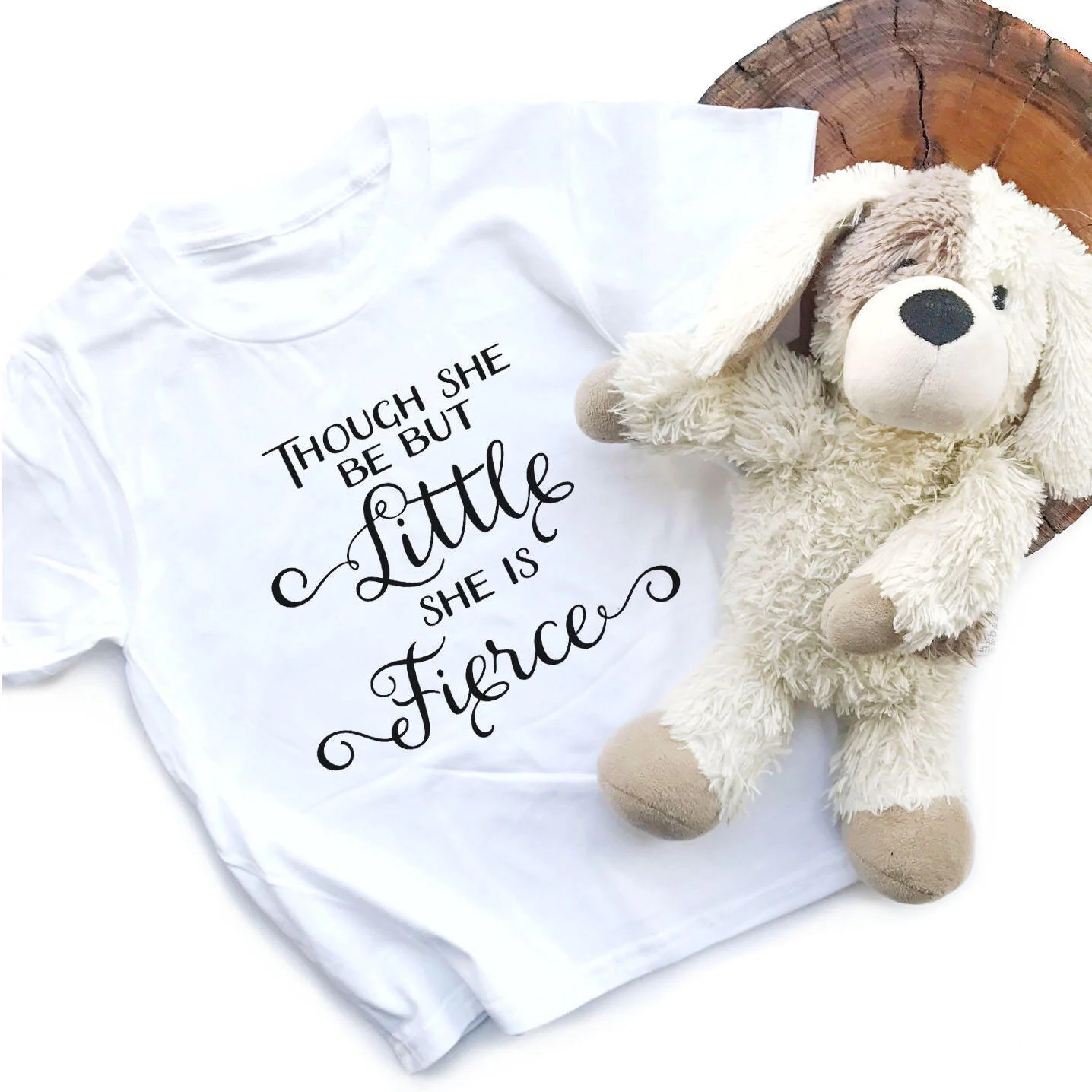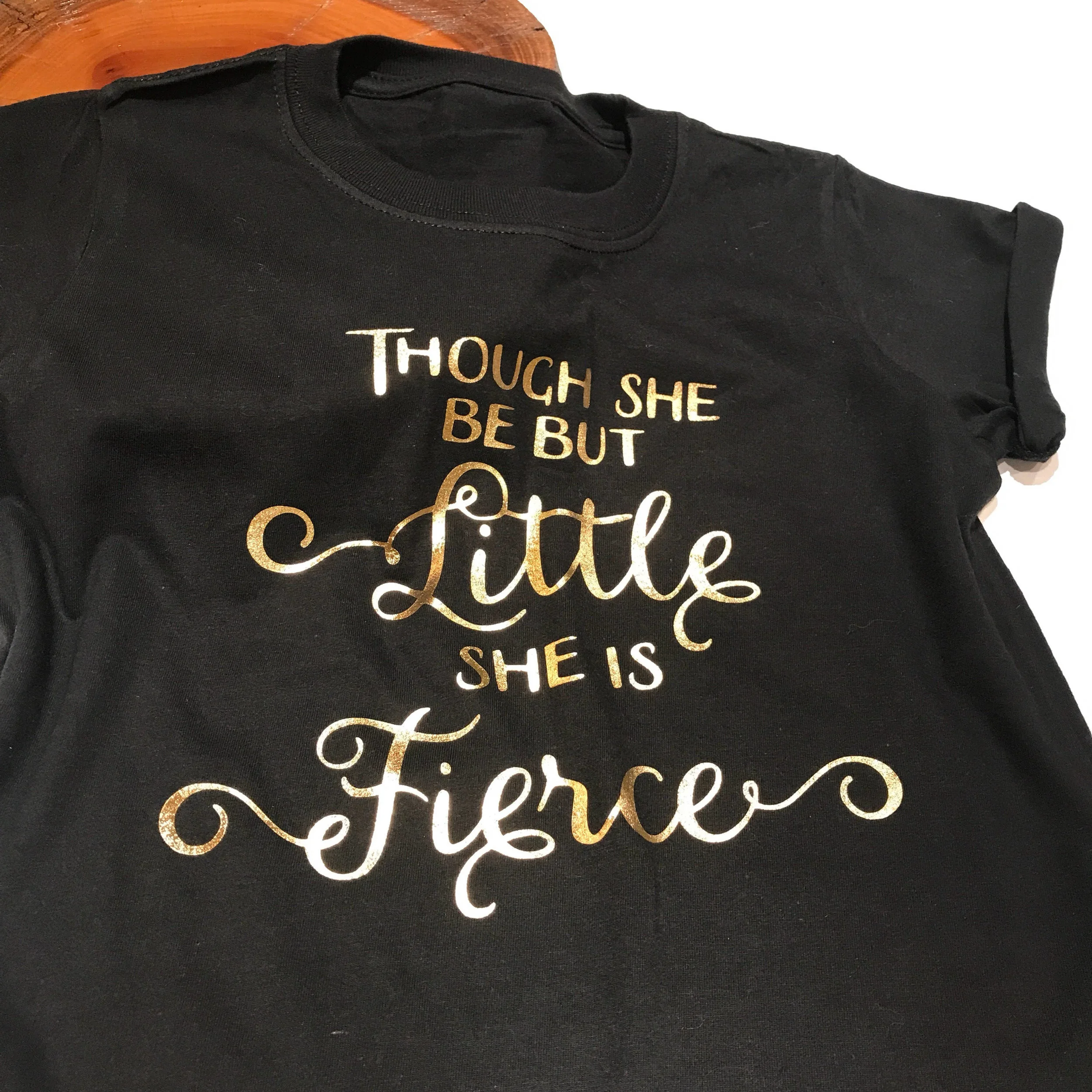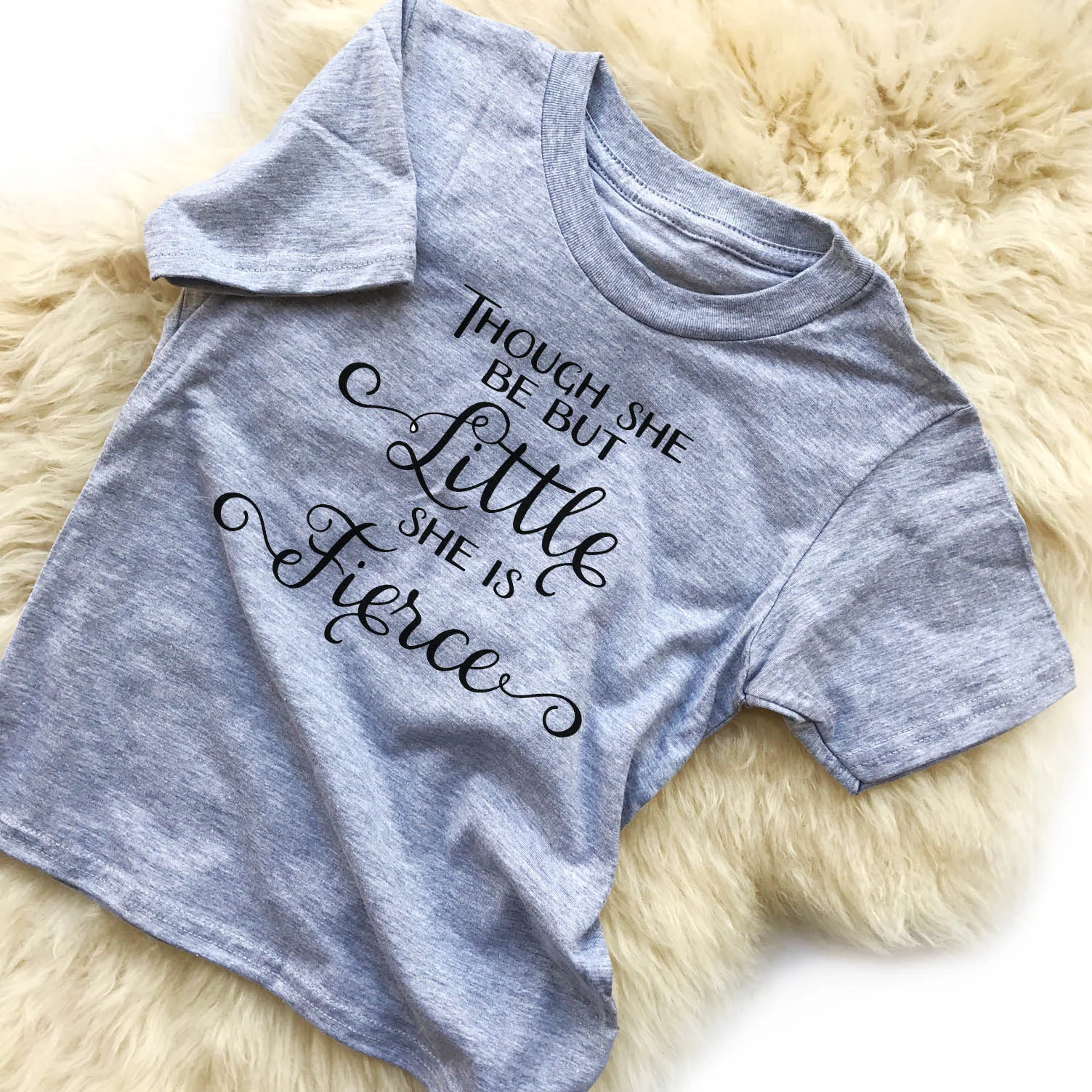 Though she be but little she is fierce kids t-shirt is perfect for your feisty little girl. Whether you're raising a Shakespeare loving bookworm or the quote just fits her personality, this design will let everyone know she's a force to be reckoned with!