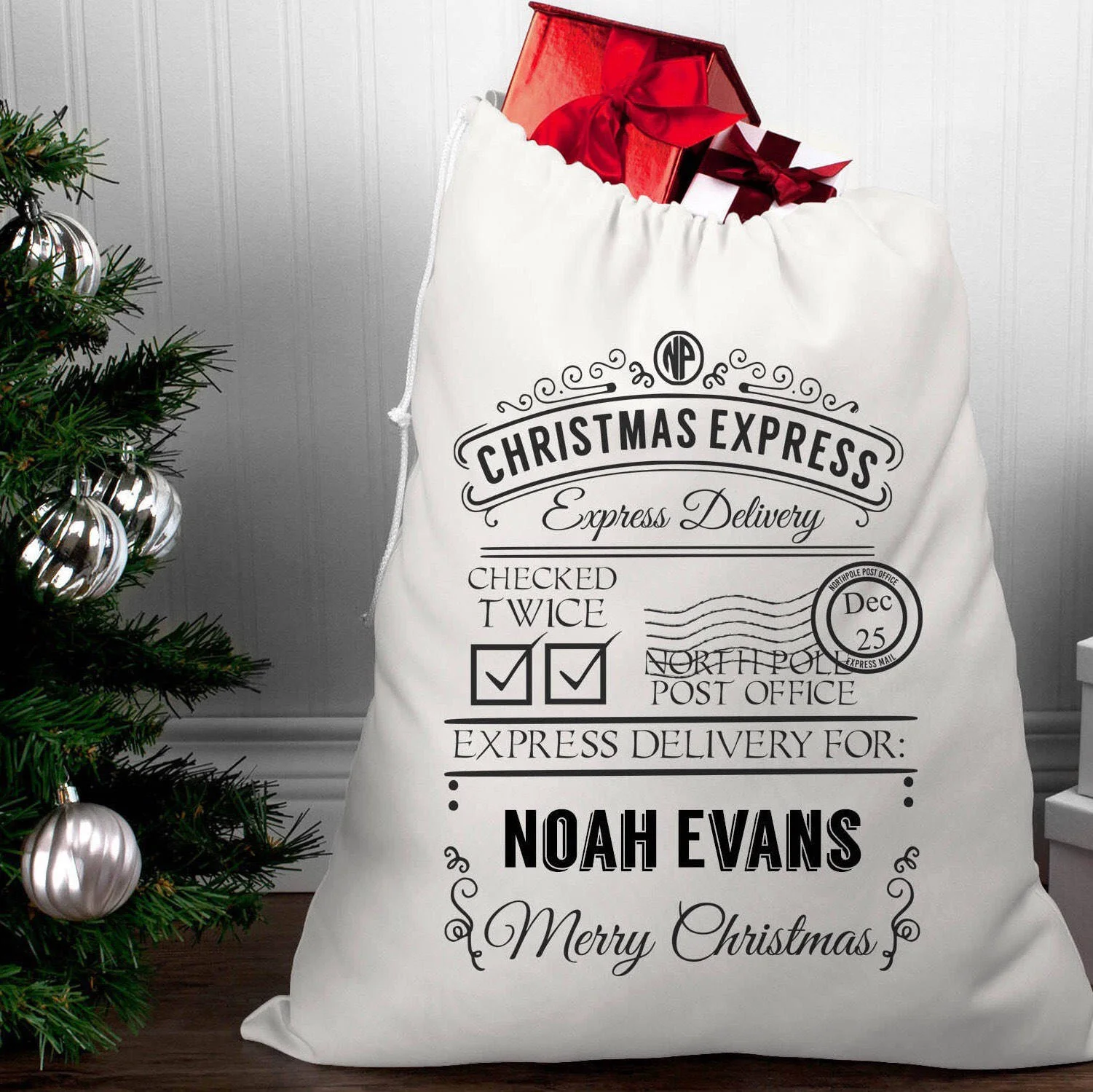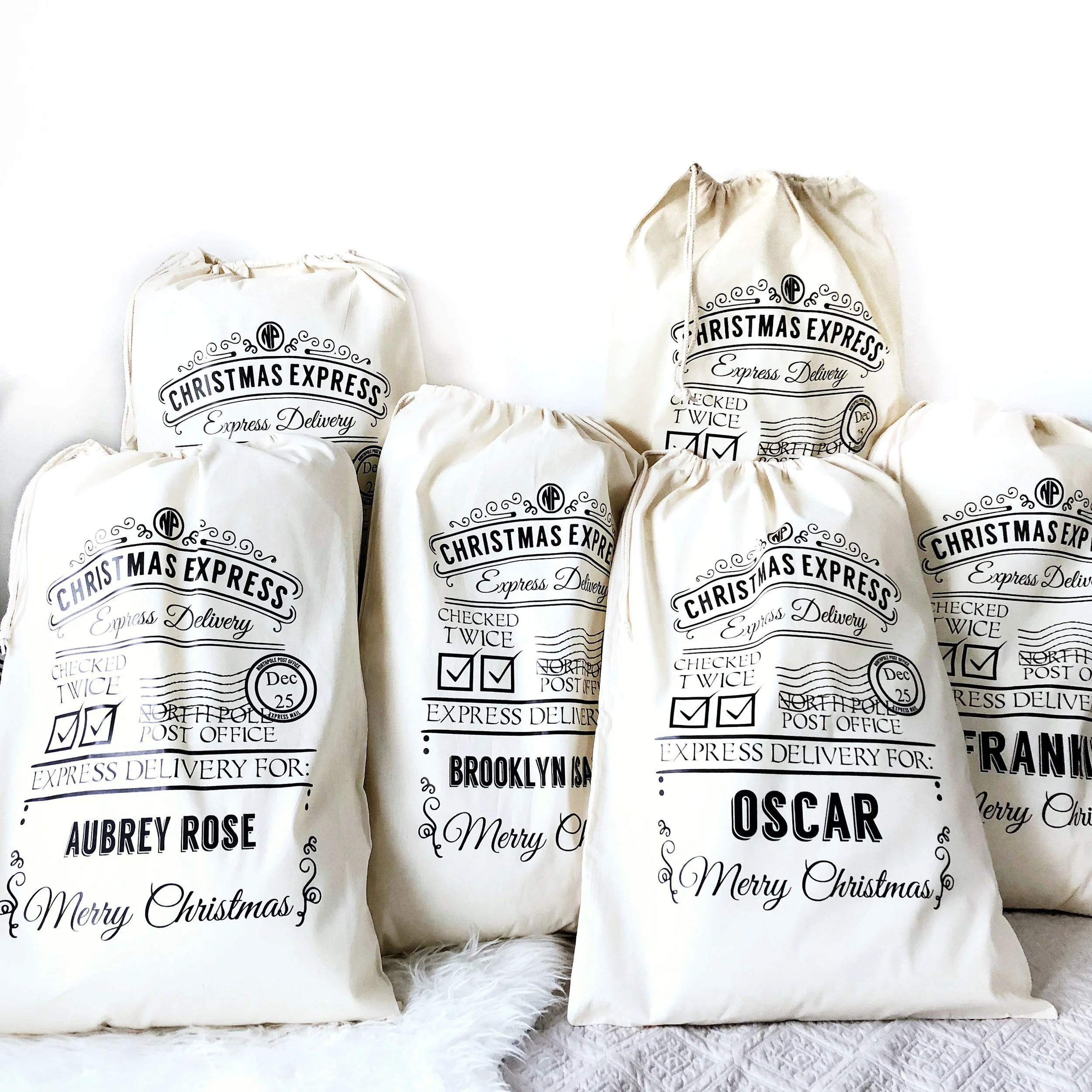Personalised with the name of your choice. You can have the FIRST NAME & SURNAME or just FIRST NAME on your Christmas sack. Names are written in all uppercase in black or gold print.